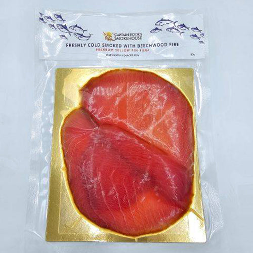 Premium Pacific Yellow Fin Tuna Smoked using old family recipe with real beechwood chips. Vaccum seal and packed ready to eat.